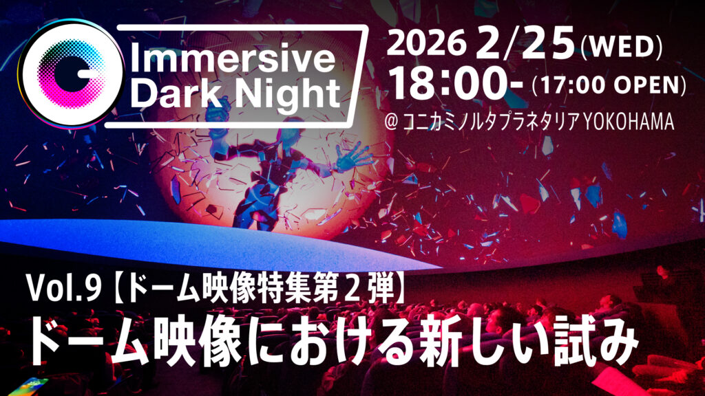 日本国内に2館しかないLEDドームスクリーン。そのひとつである横浜にあるコニカミノルタプラネタリアYOKOHAMAで『イマーシブ・ダークナイト』を開催します。まずはLEDスクリーンの明るさと色の再現性を体感していただきたいと思います。また、ドームという今までの既存の四角いスクリーンとは違う画面と視野角を体験してみてください。そこで感じる没入感は今までとは違うものだと思います。今回はドームシアターの新しい活用の提案として、アメリカにある没入型エンターテインメント施設「COSM」で提供するような実写コンテンツや3D立体映像、視野角をさまざまな角度から検証する実験映像を解説を交えてお届けします。そのほか昨年10月に開催された国際科学映像祭から国内外の優秀作品をセレクションし上映します。また今回は昨年9月からおこなってきた学生向けのドーム制作ワークショップ『ドームクリエイションワークショップ』の作品発表と講評も行います。